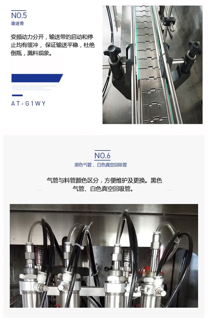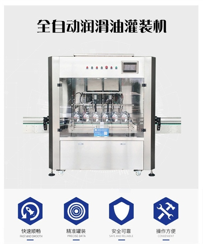 全自動六頭柱塞式潤滑油灌裝機(jī)六頭柱塞式全自動潤滑油灌裝機(jī) 設(shè)備簡介: 該六頭柱塞式全自動潤滑油灌裝機(jī)獨(dú)特的灌裝頭設(shè)計及真空回吸系統(tǒng),確保灌裝過程無殘油滴漏,快慢雙速灌裝,灌裝速度可調(diào),杜絕溢瓶現(xiàn)象